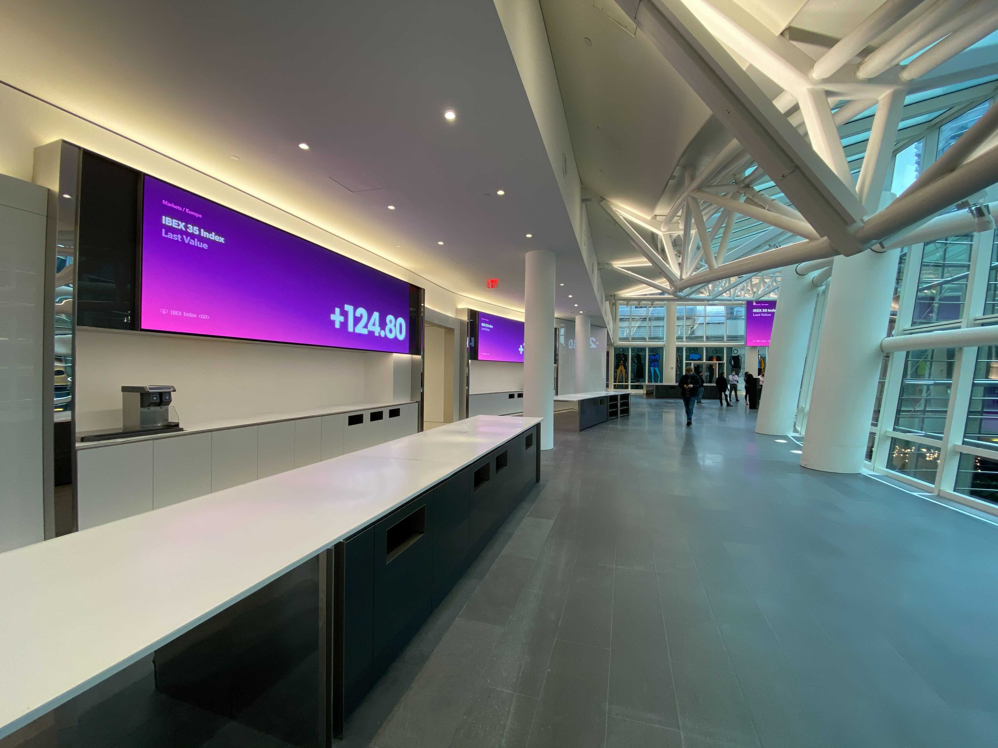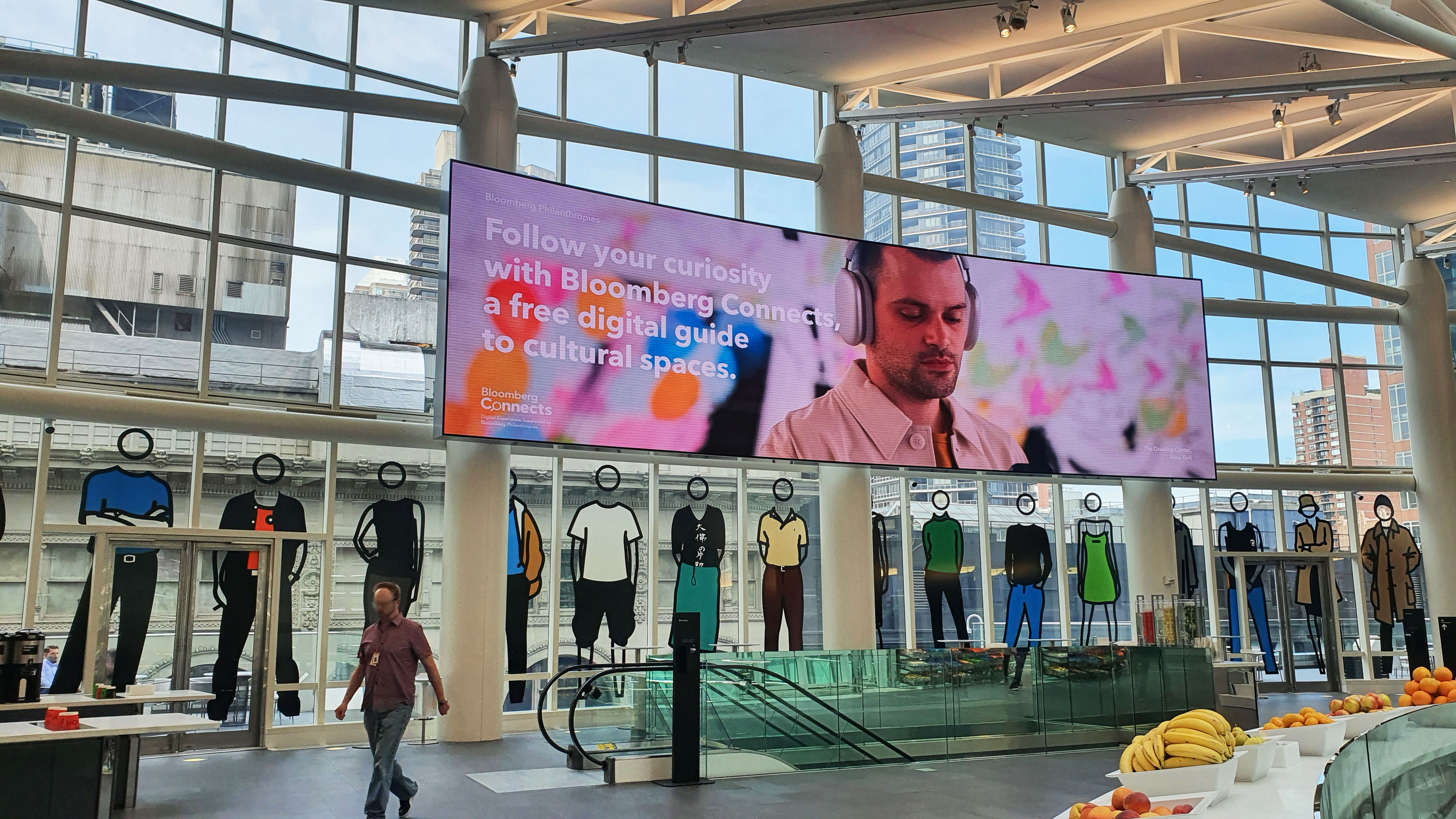 In time for the renovations at Bloomberg headquarters in New York, Bloomberg launched the next generation of their in-house Digital Signage solution. Designate once again helped develop the system architecture for the product and supported the designers and developers at Bloomberg to create a highly flexible solution. The 24/7 system supports multi-screen installations with custom resolutions and dynamically loads templates integrating various real-time data feeds, images, videos, and motion graphics.