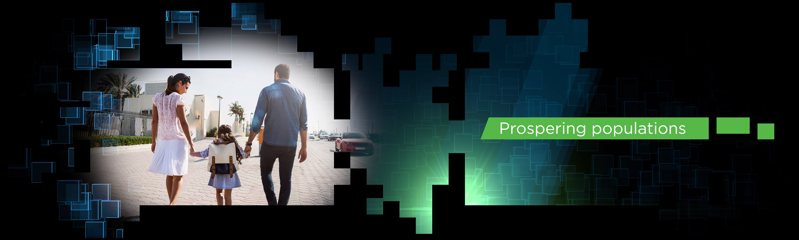 Designate implemented the Dubai Pulse 2016 report for the Dubai Executive Council. It featured a detailed explanation on the performance based on key performance indexes and objectives. The data was integrated in an interactive comic strip animation, illustrating a day in the life of an Emirati family. The presentation ran in real-time across three curved 4K screens.