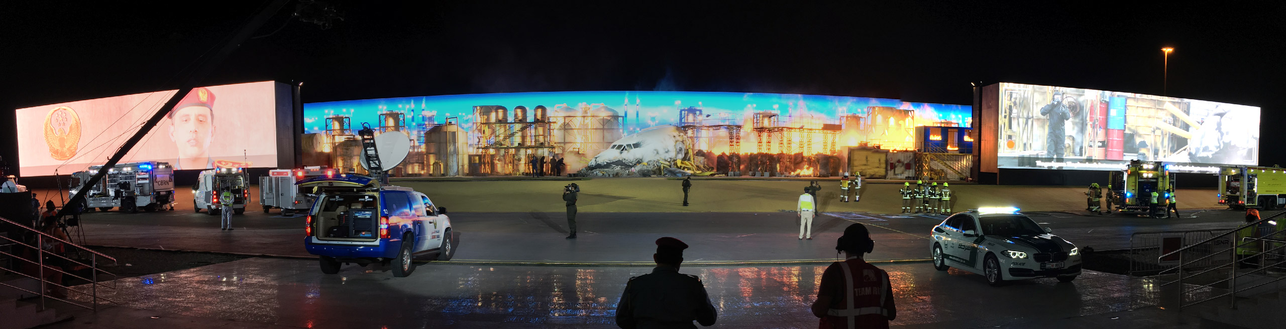 For the opening show of the ISNR exhibition 2016 in Abu Dhabi the UAE Security and Police forces performed a live stage show, demonstrating their operational capacities during a simulation of a cargo aircraft crash on a chemical factory. Designate produced and designed all live motion graphics supporting the pre-show and actual live stage event.